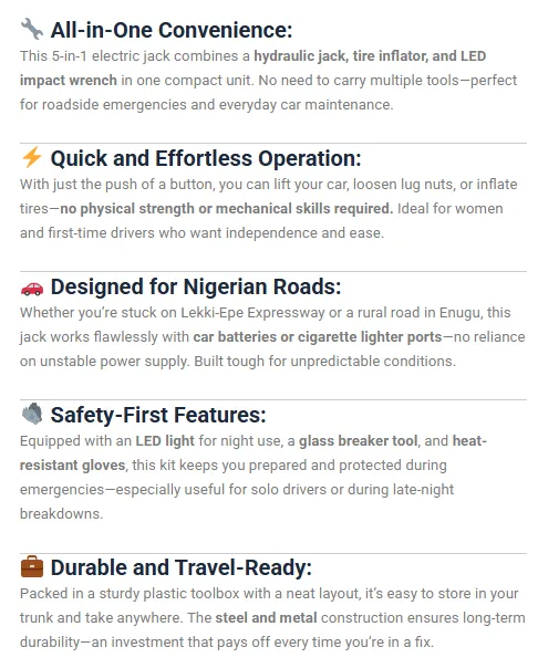 Ayodele L. “I’ve been keeping this 5-in-1 jack in my car for a month now, and honestly, the difference is incredible. A flat tire used to ruin my whole day, but now I just plug it in, press a button, and my car is lifted in seconds. The air pump and wrench make everything so easy, and I actually feel confident driving anywhere. It’s powerful, reliable, and has already saved me twice on the road. I honestly love it!”